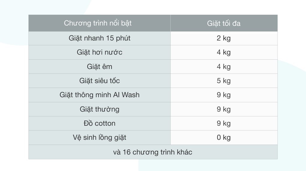 Sản phẩm có 8 chương trình giặt nổi bật: giặt nhanh 15 phút, giặt hơi nước, giặt êm, giặt siêu tốc, giặt thông minh Al Wash, giặt thường, đồ cotton, vệ sinh lồng giặt. Đặc biệt, chương trình giặt êm hạn chế tiếng ồn trong quá trình vận hành, giúp căn nhà của bạn luôn yên tĩnh. (Xem chi tiết tại bảng TSKT).
