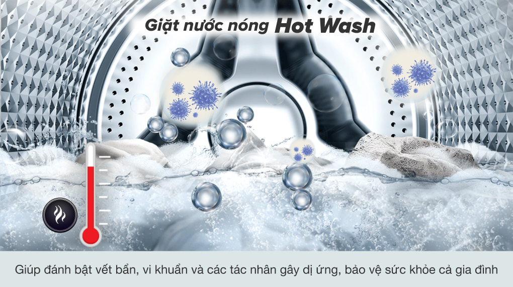 Công nghệ giặt nước nóng Hot Wash đánh bật các loại vết bẩn cứng đầu như dầu mỡ, bùn đất,... Đồng thời nhiệt độ cao còn tiêu diệt các loại vi khuẩn - tác nhân gây dị ứng mà giặt thông thường không thể loại bỏ, bảo vệ an toàn làn da nhạy cảm cho gia đình.