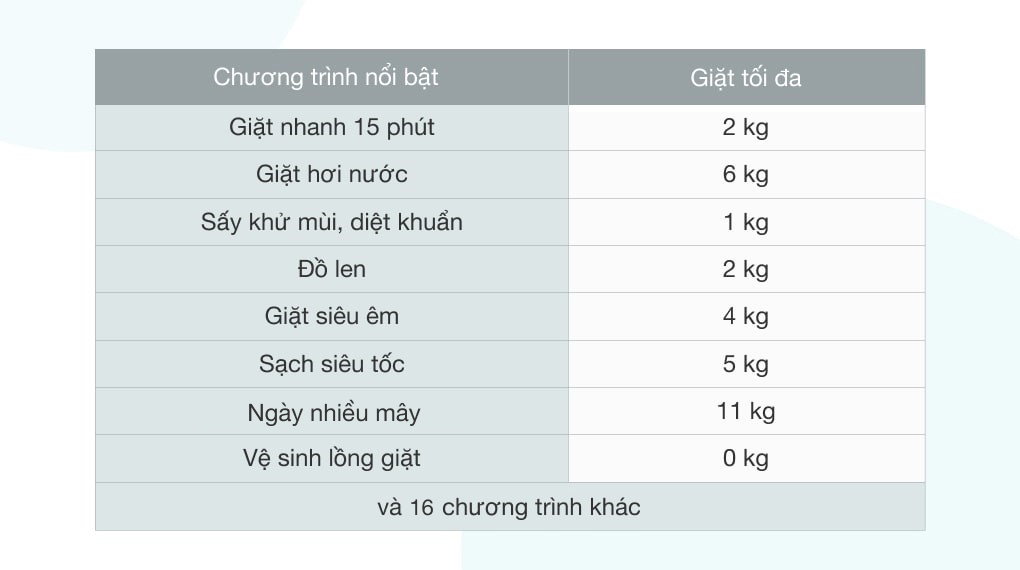 Sản phẩm có 8 chương trình giặt thường dùng: giặt nhanh 15 phút, giặt hơi nước, sấy khử mùi, diệt khuẩn, đồ len, giặt êm, sạch siêu tốc, ngày nhiều mây, vệ sinh lồng giặt và 16 chương trình khác (xem chi tiết tại bảng thông số kỹ thuật). Bên cạnh chương trình giặt nhanh 15 phút giúp tiết kiệm thời gian thì còn có chương trình giặt hơi nước giúp quần áo của bạn được làm sạch và diệt các chất gây dị ứng có trên quần áo, phù hợp cho những người có làn da nhạy cảm.